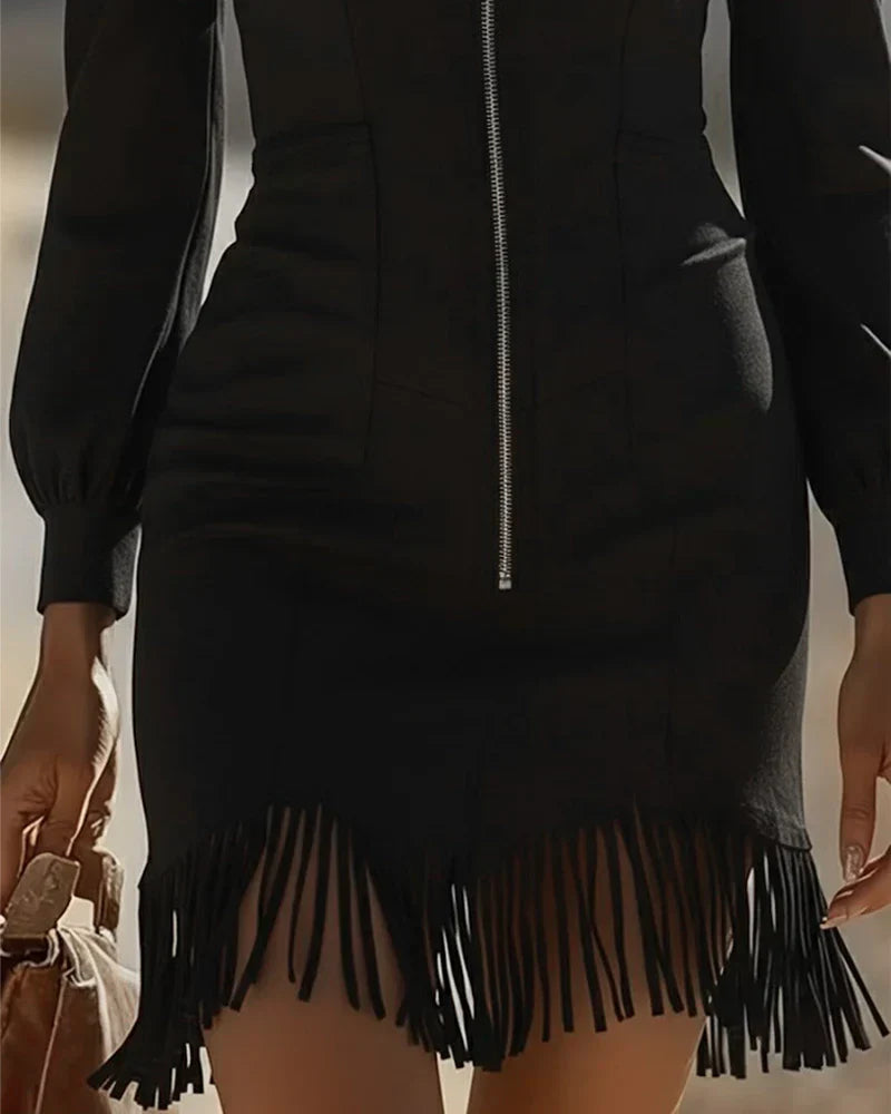 このミニドレスは、フロントジップと立体的なシェイプが特徴で、着るだけで洗練されたシルエットをつくります。長袖デザインとフリンジヘムの組み合わせが、動きと構築的な美しさを両立し、印象的な仕上がりに。デイタイムのお出かけや集まり、カジュアルスタイルを格上げしたい時に最適です。