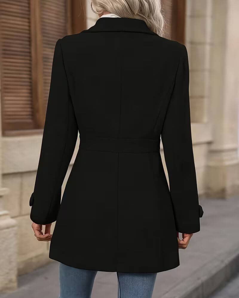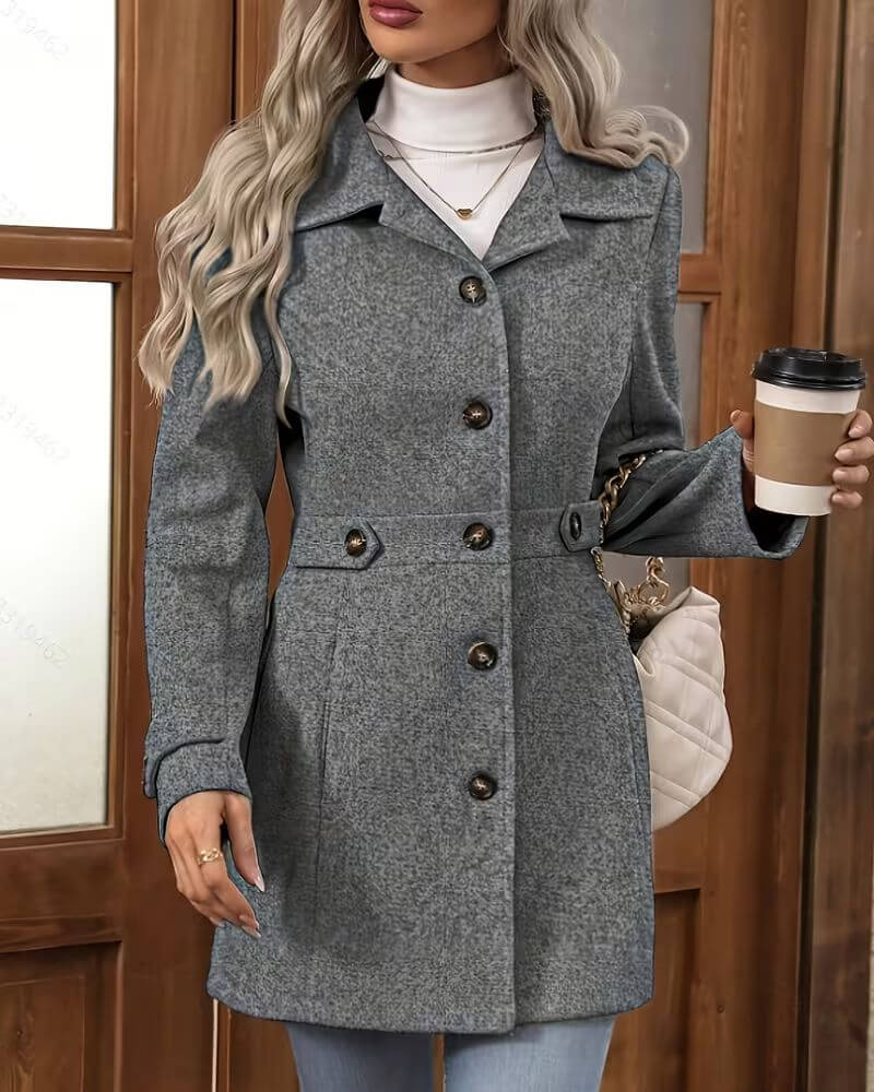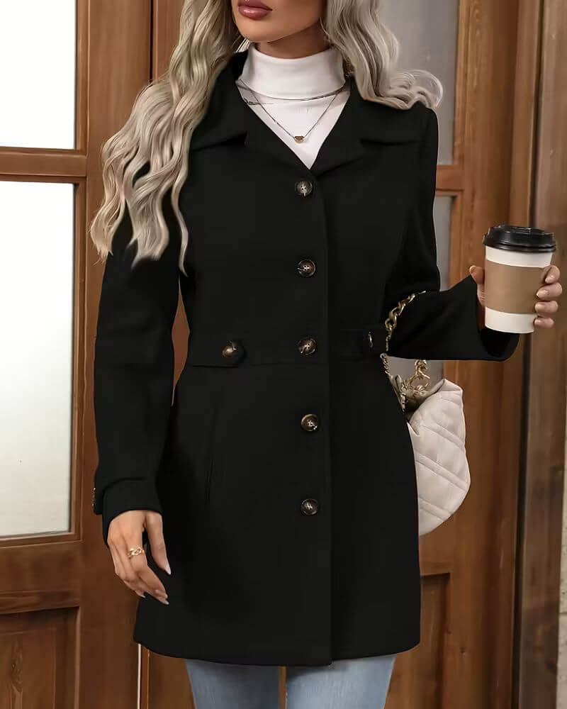 このコートは、立体的なシルエットとクリーンなボタンフロントが特徴で、上品な印象を演出します。ウエストラインを引き立てた仕上がりは、カジュアルにもフォーマルにも自然に馴染みます。